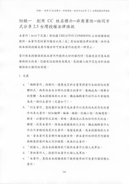▲ 圖2 將創用CC 「姓名標示-非商業性-相同方式分享台灣 2.5 版」法律條款全文添附於論文附錄之範例