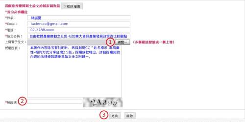 二、至「臺灣博碩士論文知識加值系統」徵求授權的網頁 (http://ndltdcc.ncl.edu.tw/get_thesis_authorize.php) 上傳論文全文的電子檔案並填註相關資訊