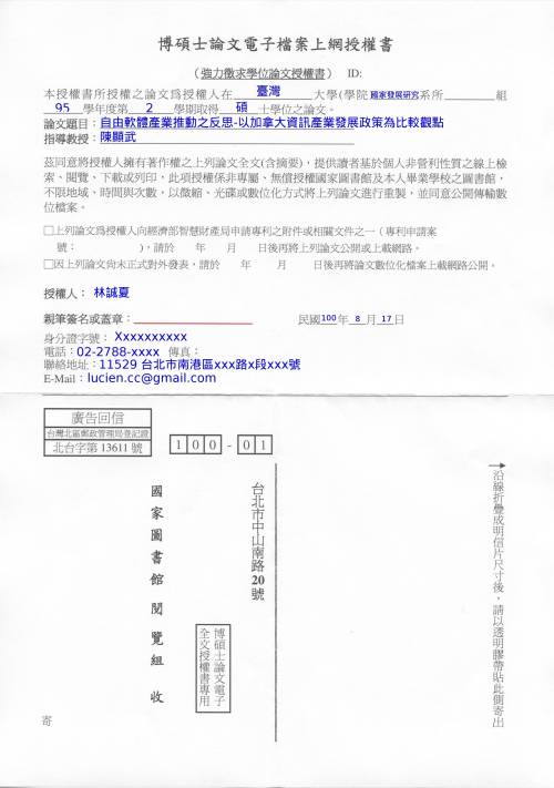 ▲ 圖4 國家圖書館博碩士論文電子檔案上網授權書
