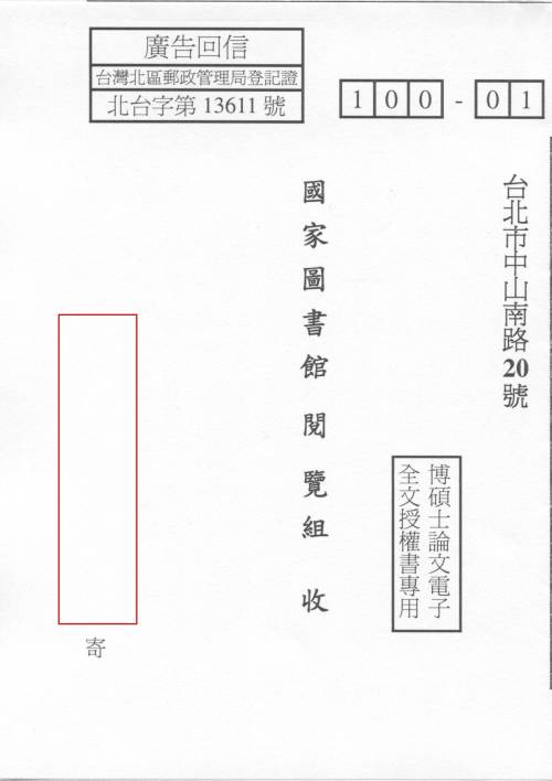註一:「臺灣博碩士論文知識加值系統」徵求授權的說明網頁與論文全文電子檔案的上傳網址:http://ndltdcc.ncl.edu.tw/get_thesis_authorize.php