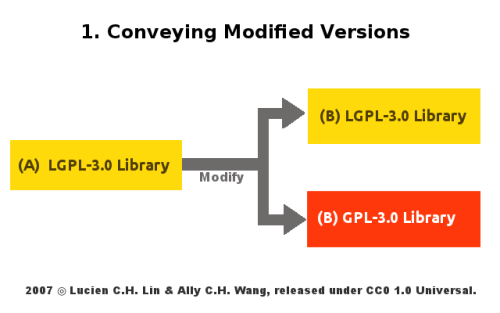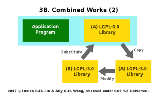 LGPL-3.0 第 3 條講述的是對於 LGPL-3.0 函式庫本身進行修改,其後所必須遵守的義務性規定,由下圖來看、LGPL-3.0 授權的函式庫 A,經過使用者修改後成為衍生作品 B,此一衍生作品會受到 LGPL-3.0 授權條款的拘束,所以其授權方式可以選擇沿用 LGPL-3.0 或是轉成 GPL-3.0 為其再散布時的授權條款,端視修改者願意盡到何種程度的配合義務。而如果最後的決定是沿用 LGPL-3.0 授權方式的話,LGPL-3.0 進一步要求函式庫 B 的修改者,不可安插僅得由特定「應用程式」呼叫方可運用的功能到函式庫 B 裡,但如果這樣的狀況真的發生了,那麼修改者會被 LGPL-3.0 責付一個進階義務,那就是提供此一獨有功能的細部資訊,供其他使用函式庫 B 的人,也可自行研讀相關資訊後,透過其他應用程式開啟函式庫 B 這個特定功能,而若修改者不願意提供這部份的細部資訊,則 LGPL-3.0 律定、此時經其修改過的函式庫 B,依條款規定便僅能以 GPL-3.0 為其再散布時之授權條款!如此設計的原因,是因為考量到若函式庫 B 的某些功能,須有賴特定應用程式方可進行呼叫,則無異讓具有「自由開放性」的 LGPL-3.0 函式庫,在後續修改、改版上,受到私有應用程式軟體 (proprietary application) 的變相拑制,是以若 LGPL-3.0 函式庫的修改者,不願意提供其應用程式與函式庫呼叫流程的深入資訊,則 FSF 便透過 LGPL-3.0 此一條款,直接透過解釋、來要求函式庫 B 僅能以 GPL-3.0 的方式進行後續釋出,如此一來、因為 GPL-3.0 在授權拘束性方面具有較強的外擴性,則連結運用函式庫 B 的應用程式,亦有可能為 GPL-3.0 授權拘束性範圍所及,最後在散布上、也就會被視為一體,而必須適用 GPL-3.0 授權條款的方式來提供程式原始碼,以 FSF 的立場來看、其便毋庸擔心函式庫的未來發展,受到私有應用程式隱性的拑制。