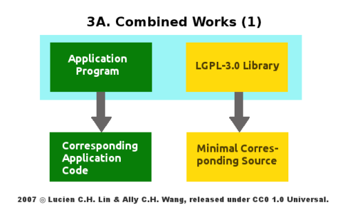 以下圖來說、其表彰的即為「組合作品」中一種義務性要求的踐履方式,首先 LGPL-3.0 將「組合作品」中原以 LGPL-3.0 授權的函式庫原始碼,稱為「最低限度對應原始碼 (Minimal Corresponding Source)」,「組合作品」的散布者必須連帶將這部份的程式原始碼,一併散布予收受「組合作品」的後手;再者、即為「應用程式對應碼 (Corresponding Application Code)」的供給,此一「應用程式對應碼」未必為原始碼格式,多數情況下可能僅以目的碼的形式來表現,那麼究竟「應用程式對應碼」的指稱範疇為何?其實、其指的便是應用程式與函式庫之間「產生連結、進行呼叫、資訊提供與數據反饋」的相關流程與資料,依此等資料、收受「組合作品」的後手可以據其重建應用程式與改版後 LGPL-3.0 函式庫之間的連結關係,不致使得 LGPL-3.0 函式庫經過修改與調整後,原先的組合作品即無法正常運作。