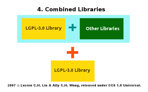 LGPL-3.0 採用與 LGPL-2.1 頗為不同的條款敘述方式,其授權條款第 3 條至第 6 條本文, 分別述明了 LGPL-3.0 函式庫四種不同的應用模式,以下即以圖例輔助說明之。