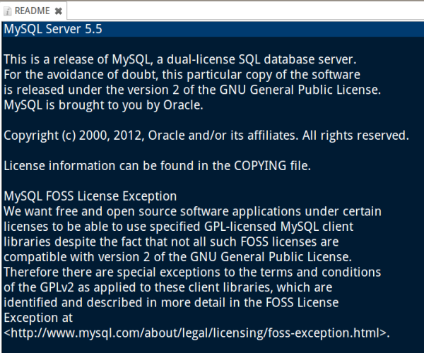 ▲ 圖1 MySQL 5.5.25 自由開源版本中 README 的授權資訊