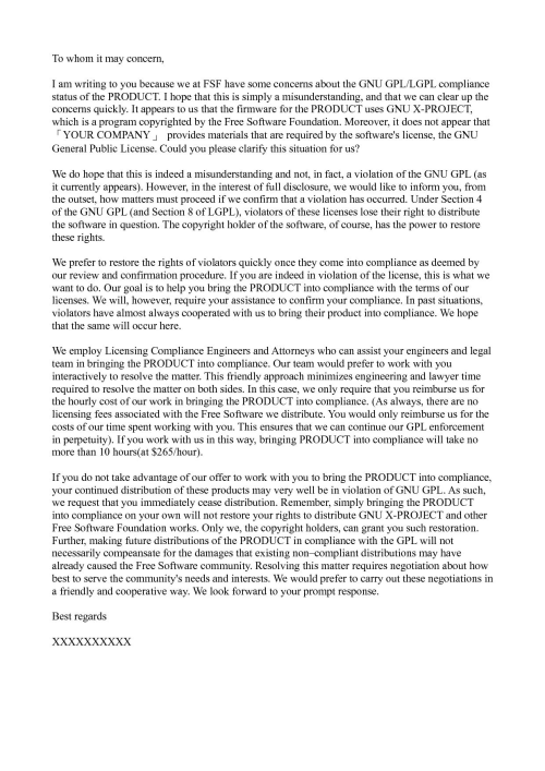 原則上一封正式的自由開源專案侵權警告信件的內容,會有以下幾個重點訴求: